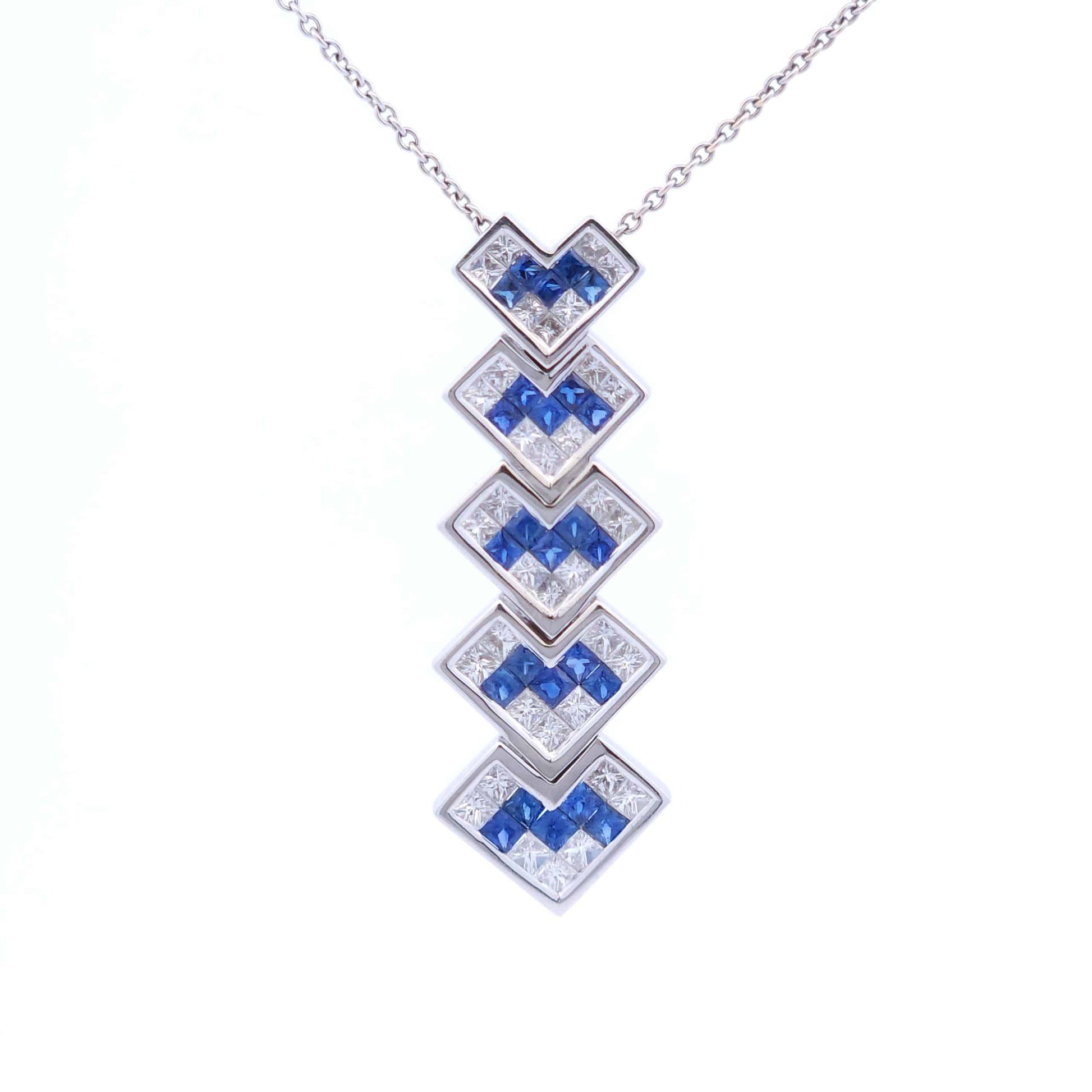 This designer pendant features a total carat weight of .91 princess sapphires set in 18K white gold. This pendant also features a special invisible setting of princess diamonds with a total carat weight of .91.
