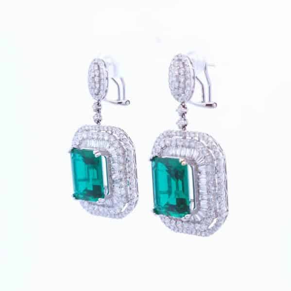 These designer dangling earrings feature a total carat weight 16.43 lab emeralds. These earrings also have a double halo design with 7.74 carats of round diamonds and 7.74 carats of baguette diamonds. This one of a kind designer piece comes set in 18K white gold. The Jewelry Exchange offers captivating factory direct gemstones at the guaranteed lowest prices on the market, saving you up to 80% compared to other retailers!