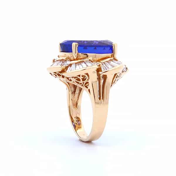 This unique ring has a total weight of 17.26 Carats. The beautiful oval tanzanite center stone is 15.10 carat total weight, and features 1.89 carats of baguette diamonds, all set in 14k yellow gold.