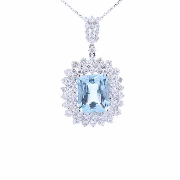 This designer pendant features a 5.11 carat emerald shaped aquamarine as the center stone. Surrounding the aquamarine are round diamonds with a total carat weight of 3.30 carats set in 18K white gold.