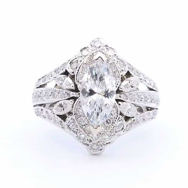 Meticulously handcrafted in the U.S. This stunning piece features .31 ct of marquise diamonds and .78 ct of round diamonds, elegantly set in 18K white or yellow gold. The center stone can be a captivating marquise cut diamond of your choice, adding a personal touch to this exceptional ring.