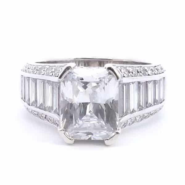 This piece is adorned with 1.21 ct of baguette diamonds and .57 ct of round diamonds set in 18K white or yellow gold. Customize the center stone with a stunning emerald-shaped diamond of your choice.