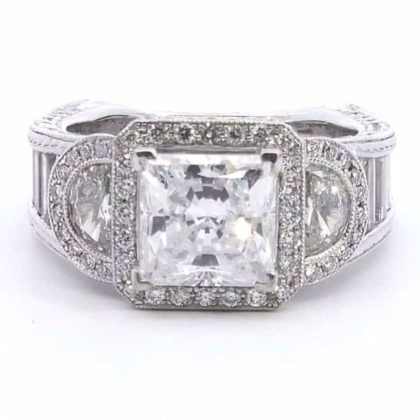 Hand crafted in the United States with precision, this stunning ring features 1.99 ct of baguette diamonds, .75 ct of round diamonds, and .73 ct of round diamonds set in a half-moon setting. The 18K yellow or white gold adds elegance to the design. Customize with a princess-cut center diamond.