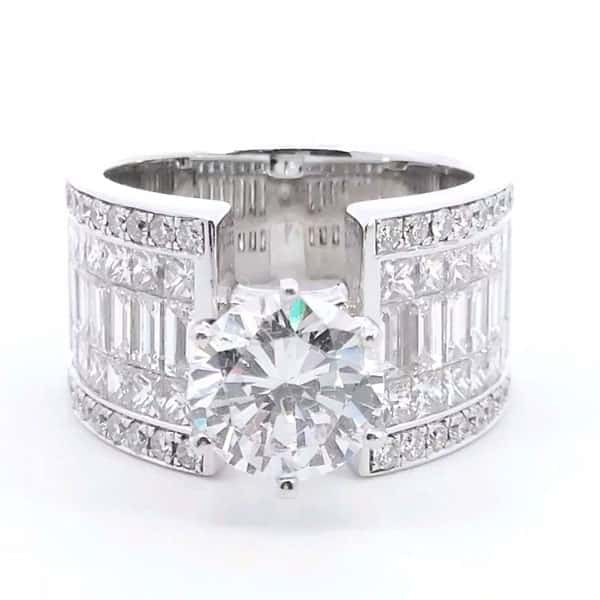 This stunning ring features 1.54 carats of princess diamonds and 1.54 carats of baguette diamonds, both skillfully set in an invisible setting for a seamless and breathtaking display. Surrounding the invisible setting are .40 carats of round diamonds prong set to add flair. Meticulously crafted in your choice of 18K white or yellow gold, this ring offers versatility and timeless beauty. The center stone setting allows for a diamond of any size or shape, making it a truly customizable piece.